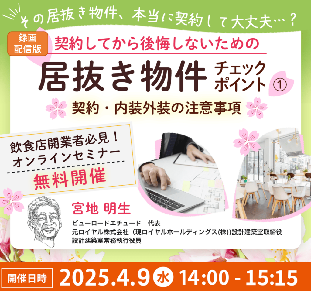 【録画配信】契約してから後悔しないための居抜き物件チェックポイント①ー契約・内装外装の注意事項ー