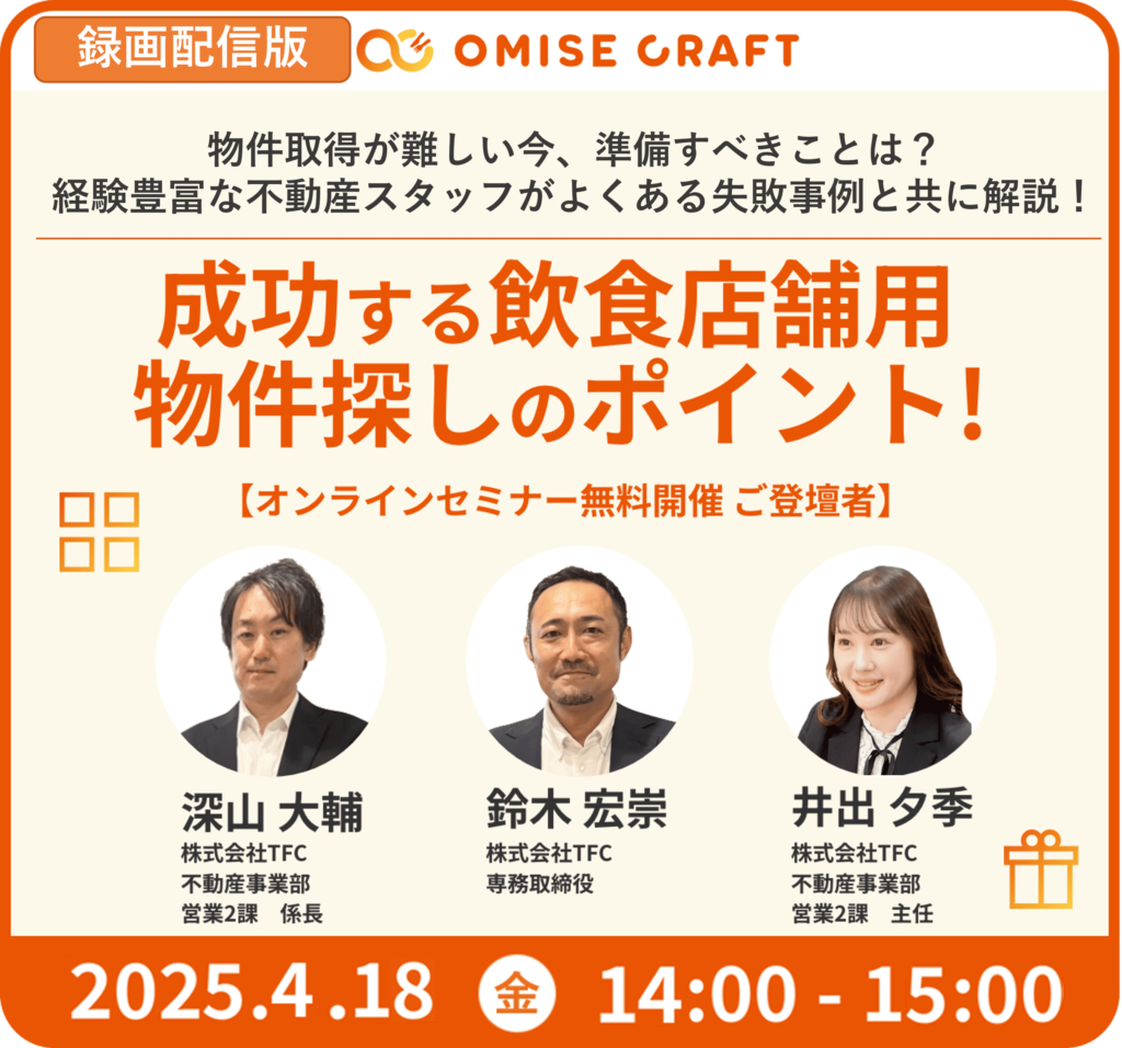 【録画配信】物件取得が難しい今、準備すべきことは?経験豊富な不動産スタッフがよくある失敗事例と共に解説!成功する飲食店舗用物件探しのポイント